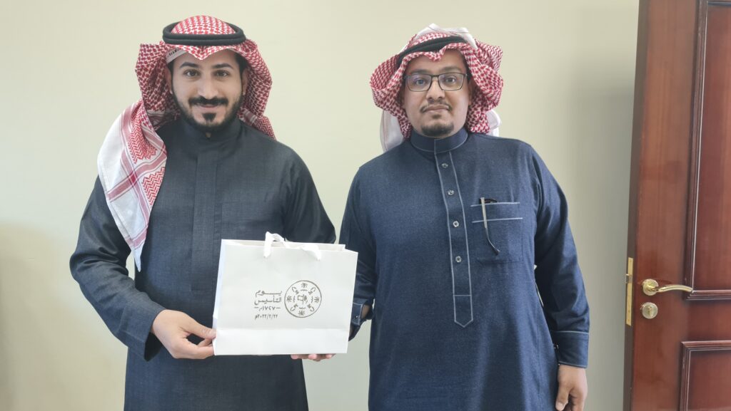 أولاً: توزيع الهدايا العينية على رئيس مركز مدينة الأجفر وعلى شيخ الويبار وعلى مدراء الجهات الحكومية وعلى مدراء مدارس مدينة الأجفر بمناسبة الاحتفال بيوم التأسيس ١٧٢٧م صباح اليوم الاثنين الموافق ١٤٤٣/٧/٢٠هـ