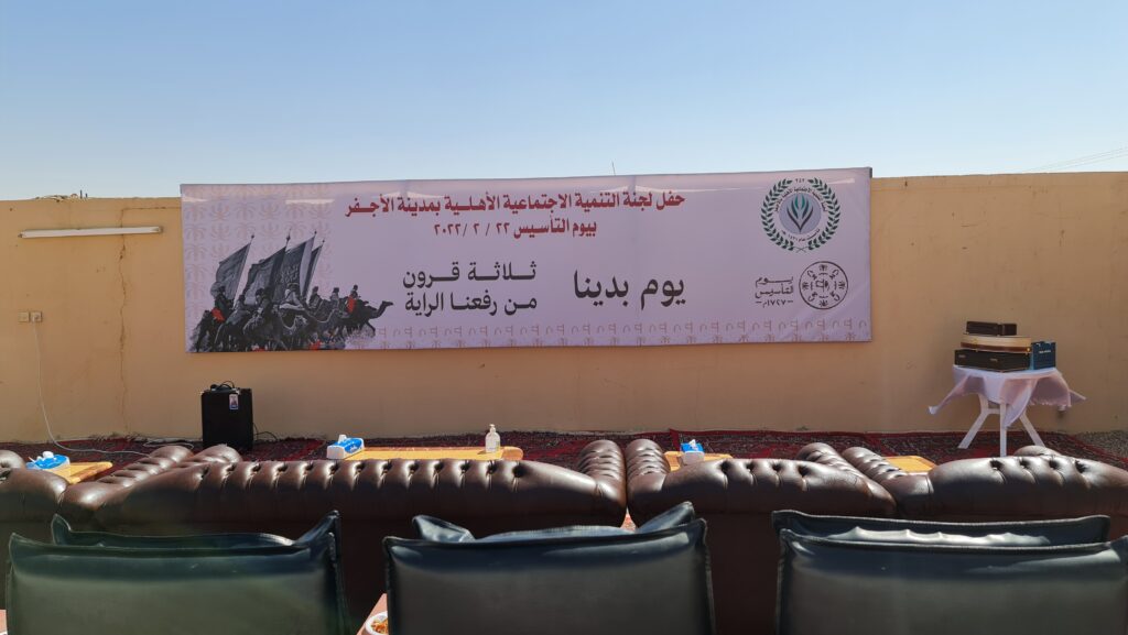 ثانياً: أقامت اللجنة ظهر الثلاثاء ١٤٤٣/٧/٢١هـ الموافق ٢٠٢٢/٢/٢٢م بمدينة الأجفر احتفالاً بمناسبة يوم التأسيس ١٧٢٧هـ بمقرها وبحضور سعادة رئيس مركز مدينة الأجفر / الشيخ: حلو بن عبد الله بن نداء بن نهير والشيخ بندر بن عبدالله بن نداء بن نهير شيخ الويبار وجمع من الأهالي وبدء الحفل بالقاء رئيس لجنة التنمية الاجتماعية بالأجفر الأستاذ / ماجد موزان الشمري كلمة ومن ثم تفضل سعادة رئيس مركز مدينة الأجفر / الشيخ: حلو بن عبد الله بن نهير بإلقاء كلمته كما ألقى الشاعر فهد عواد العويد قصيدة وطنية ونالت استحسان الحضور.
